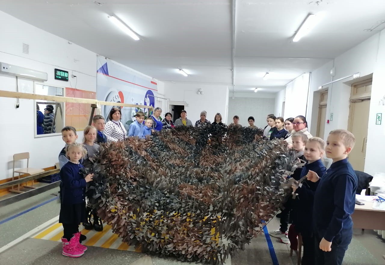 Пункт изготовления масксетей организовали прямо в фойе школы.