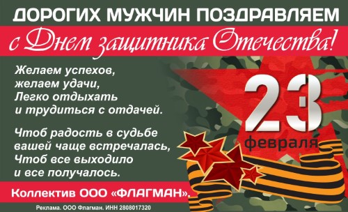 Каждый из нас вносит свой вклад в защиту Отечества, честно исполняя свой долг, оберегая покой близких и родных людей, стремясь работать на благо нашей области, ее благополучие и процветание. Отмечать праздник принято в трудовых коллективах, поздравляя мужчин с Днем защитника Отечества. На многих предприятиях давно появились свои традиции, многие из которых складывались годами. В преддверии 23 февраля редакция ТЕЛЕПОРТ.РФ готовит спецвыпуск, где поздравят всех причастных руководители амурских предприятий.